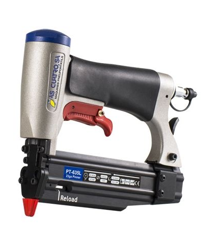 La PT 635 es una clavadora diseñada para trabajos de acabado fino, ideal para la instalación de tapetas y molduras ligeras. Compatible con clavos tipo 6 y 6 MG, admite longitudes desde 15 hasta 35 mm, ofreciendo precisión y un acabado limpio sin dañar el material.