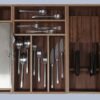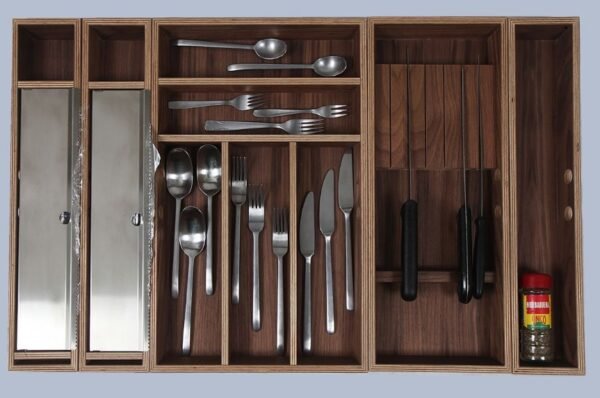 Maximiza la funcionalidad de tu cocina con nuestro cortador doble de alta gama. Este accesorio ha sido diseñado para encajar a la perfección en los compartimentos de nuestros cuberteros de madera, permitiéndote mantener el papel de aluminio y el film transparente siempre a mano, organizados y listos para un corte limpio.
