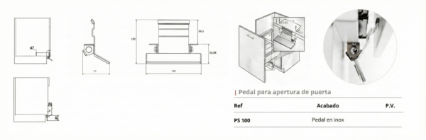 Olvídate de tocar los tiradores con las manos sucias o mojadas. El Pedal para apertura de puerta (Ref. PS 100) es la solución perfecta para añadir funcionalidad y un toque moderno a tu cocina. Diseñado especialmente para muebles bajos, como el del cubo de basura, te permite abrir la puerta de forma sencilla y sin usar las manos.