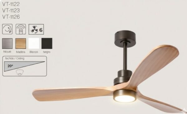 Iluminación y frescura en perfecto equilibrio. El Poniente Lighting no es solo un ventilador, es la solución completa para climatizar e iluminar tus espacios con estilo. Diseñado con una estética moderna de inspiración nórdica, combina aspas de acabado madera con un cuerpo elegante (disponible en blanco, negro y madera). Su potente luz LED y su motor de última generación lo convierten en la pieza estrella de salones y dormitorios.
