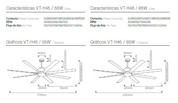¿Por qué elegir el modelo Xaloc? Dimensiones XL: Disponible en diámetros de 1720 mm (VT-1145) y 2030 mm (VT-1146) para cubrir áreas masivas con una sola unidad. Rendimiento de Alto Nivel: El modelo VT-1146 ofrece un flujo de aire de hasta 222 m³/min impulsado por un motor DC de 65W, garantizando frescura incluso en los espacios más exigentes. Construcción en Aluminio: Sus 8 aspas de aluminio aseguran durabilidad, ligereza y una aerodinámica eficiente para mover grandes volúmenes de aire sin esfuerzo. Iluminación Integrada CCT: No solo ventila, sino que ilumina con 1.960 lúmenes y temperatura de color ajustable (3000K-6000K), permitiendo crear el ambiente adecuado para cada necesidad. Motor DC Ultra-Eficiente: Equipado con tecnología de corriente continua que ofrece 6 velocidades de precisión con un funcionamiento silencioso ($<50$ dB) y un consumo energético optimizado.